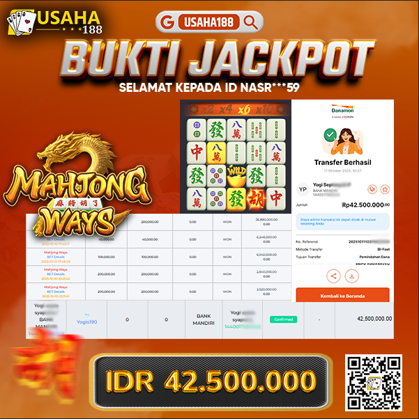 Mahjong Ways USAHA188 kembali bikin heboh! Salah satu member berhasil menembus kemenangan sebesar Rp42.500.000 hanya dari satu sesi permainan. Slot bertema klasik ini memang sering dijadikan pilihan para pemain karena pola scatter dan wild-nya gampang nyambung.