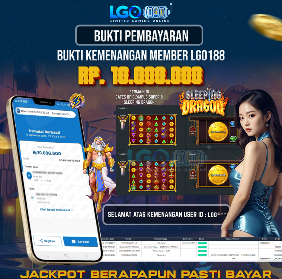 Member LGO188 menang besar Rp10 juta dari permainan Gates of Olympus dan Sleeping Dragon. Kemenangan Member LGO188 menang ini sudah dibayar lunas tanpa masalah ke rekening pemain. Transaksi withdraw dilakukan tanggal 19 September 2025 dengan bukti transfer digital yang jelas.