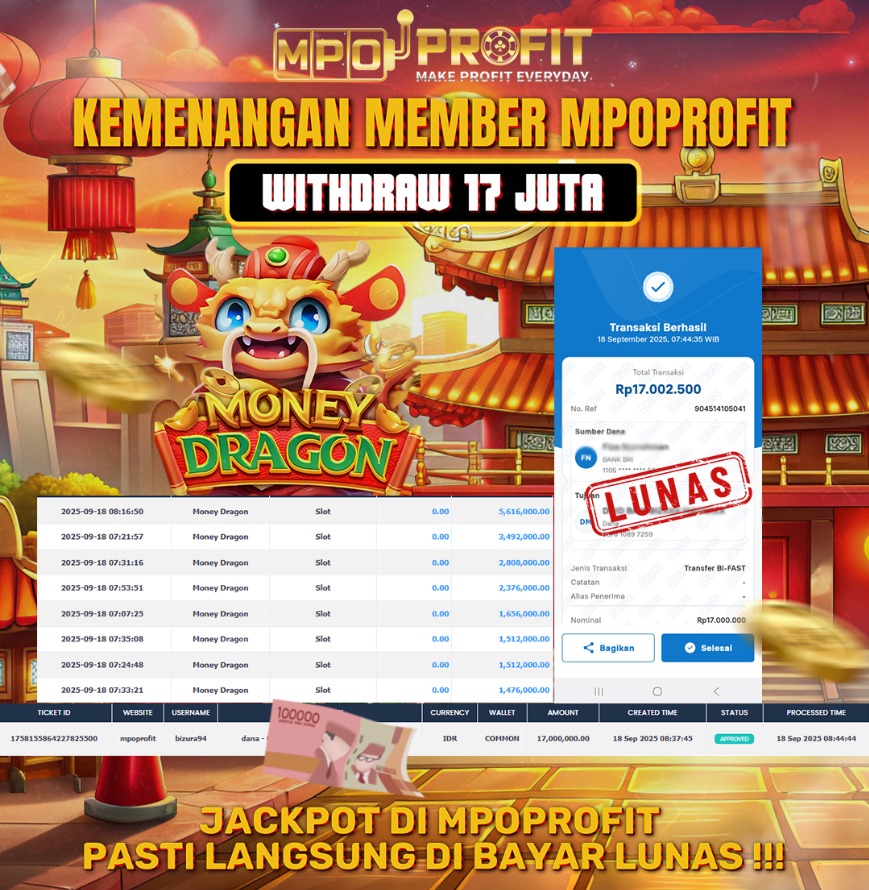 Promo visualnya juga kece abis. Nuansa oriental khas Money Dragon dipadukan dengan struk transfer digital yang jelas dan meyakinkan. Ini nunjukin kalau MPOPROFIT serius bayar penuh setiap jackpot tanpa potongan.